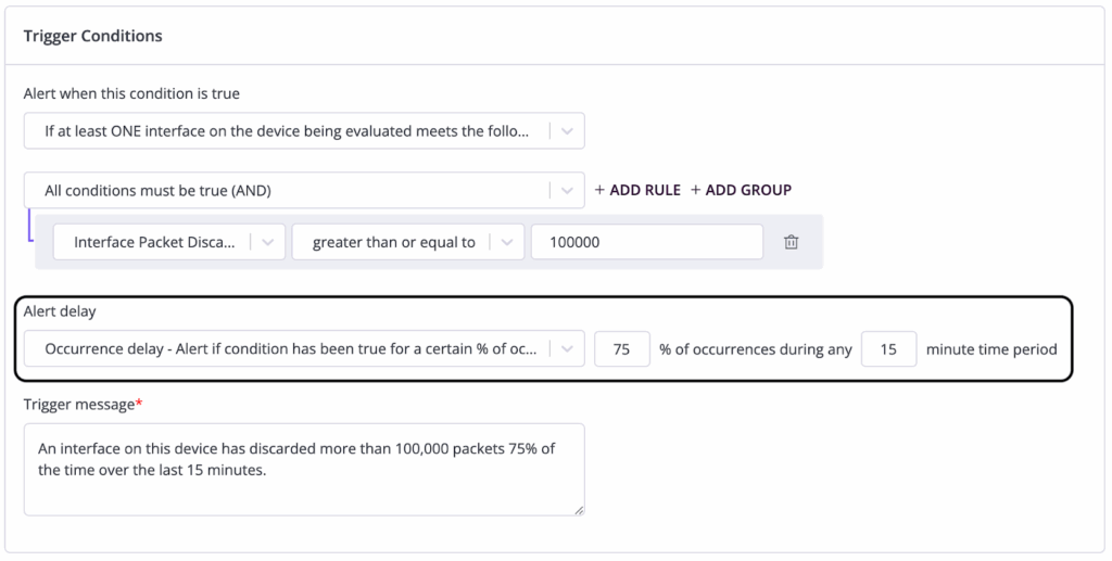 For example, the configuration below would fire an alert only if the network interface has discarded over 100,000 packets 75% of the time within a 15-minute window: